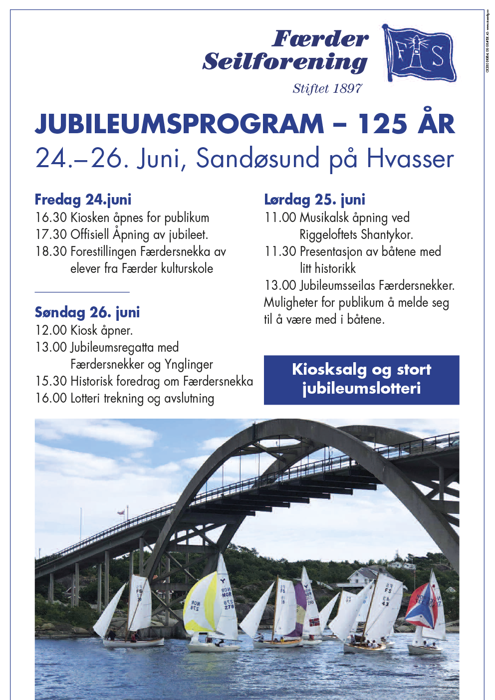 Det er i år 125 år siden Færder Seilforening ble opprettet. Den formelle stiftelsesdatoen 1897 var 24. juni, og årets jubileum vil bli behørig markert med arrangement 24., 25. og 26. juni 2022.
